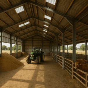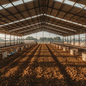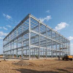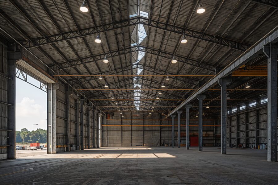 Construção de galpão industrial com estruturas robustas para indústrias, vãos livres de até 30m e capacidade para equipamentos pesados. Pé-direito alto e fundação reforçada.